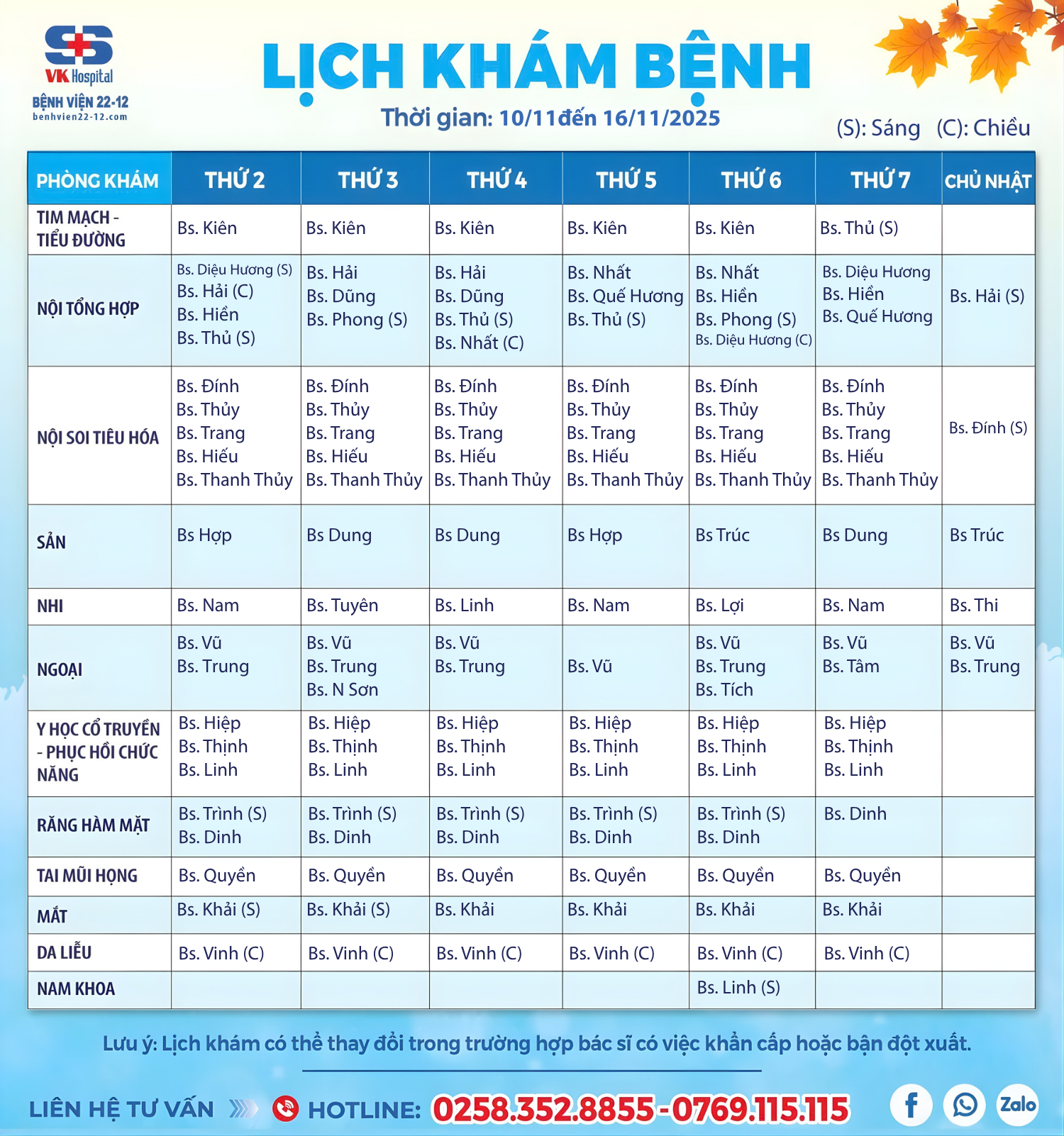 Bệnh viện 22-12 thông báo lịch làm việc từ 10 – 16/11/2025