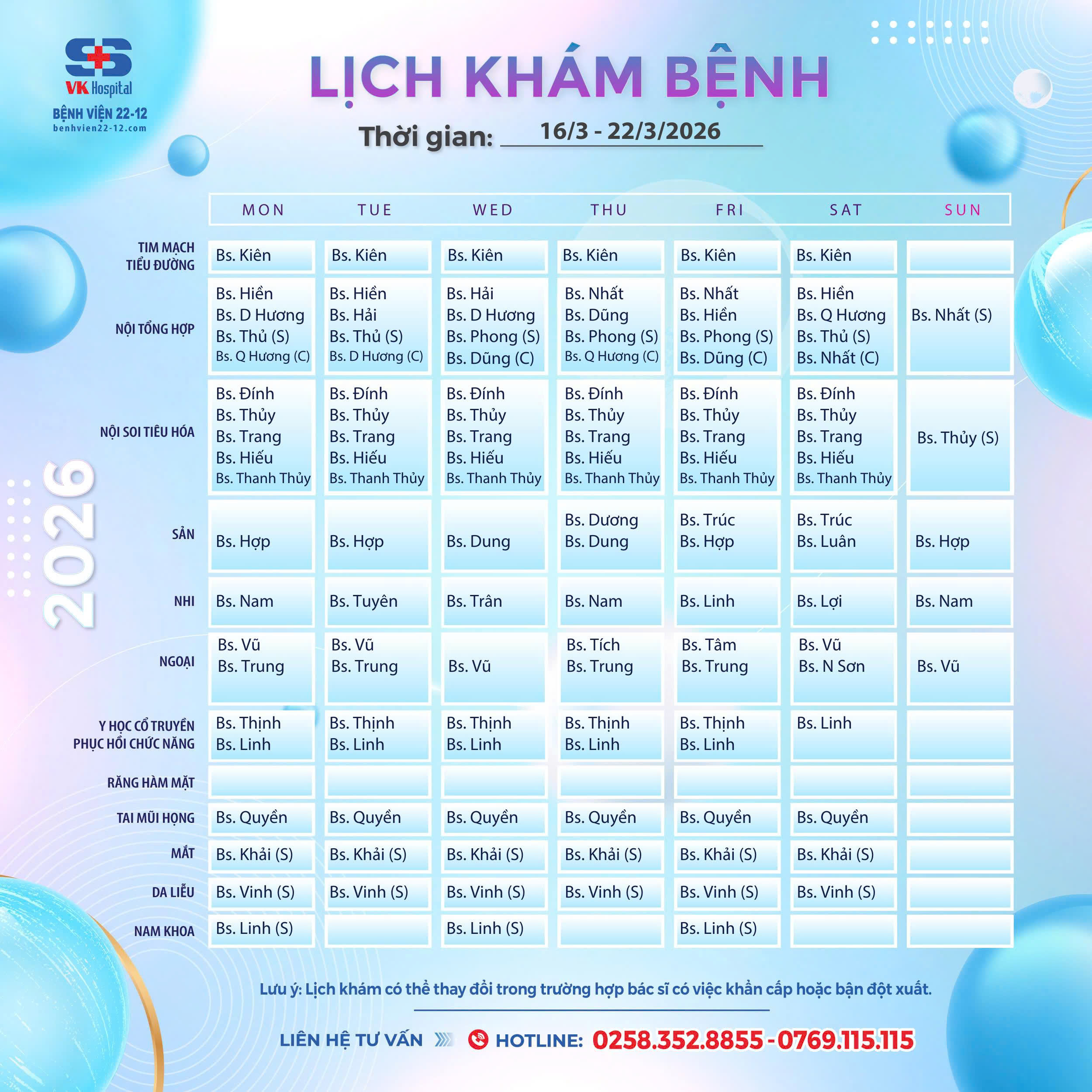 Bệnh viện 22-12 thông báo lịch làm việc từ 16/03-22/03/2026
