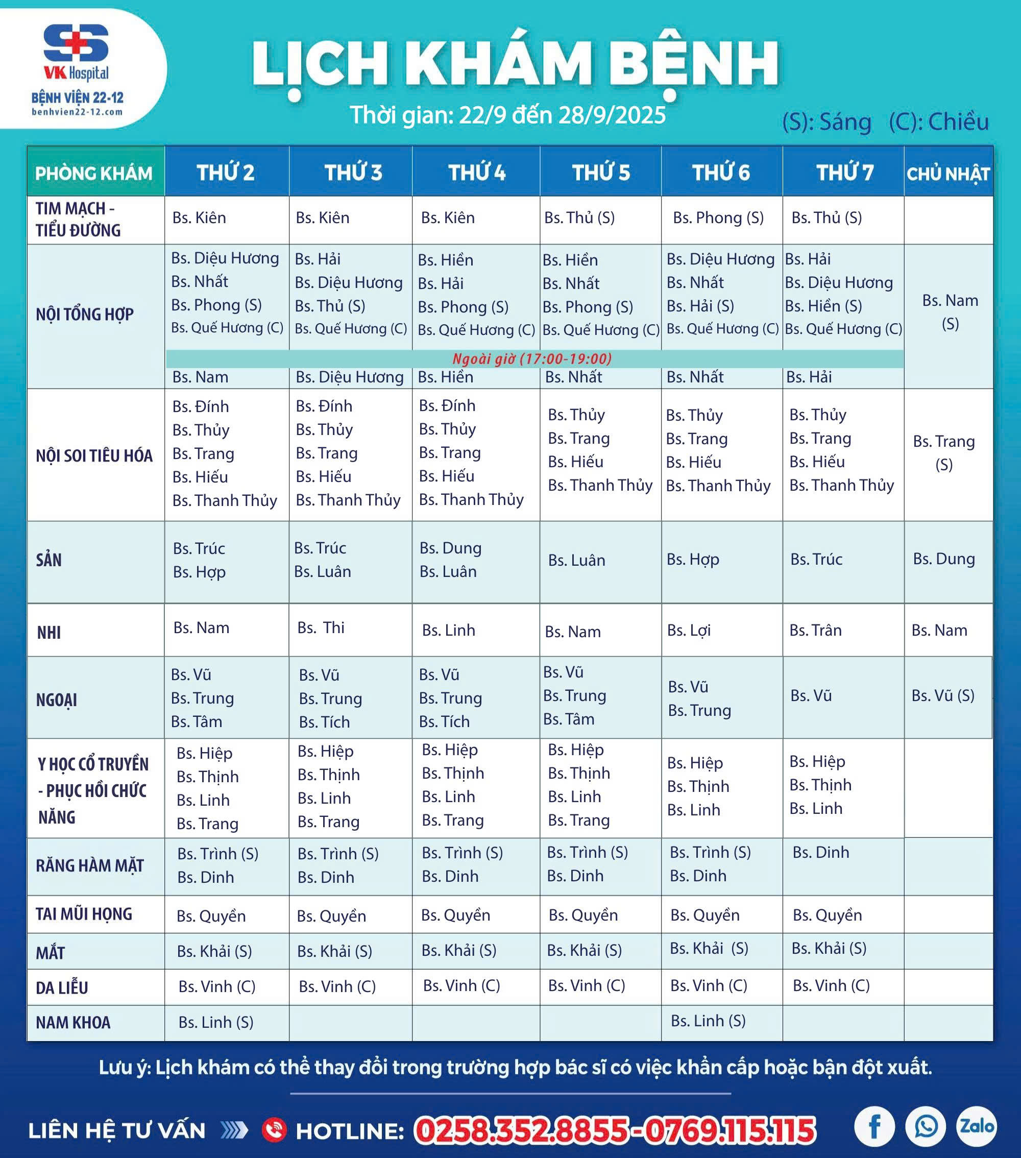 Bệnh viện 22-12 thông báo lịch làm việc từ 22/09-28/09/2025