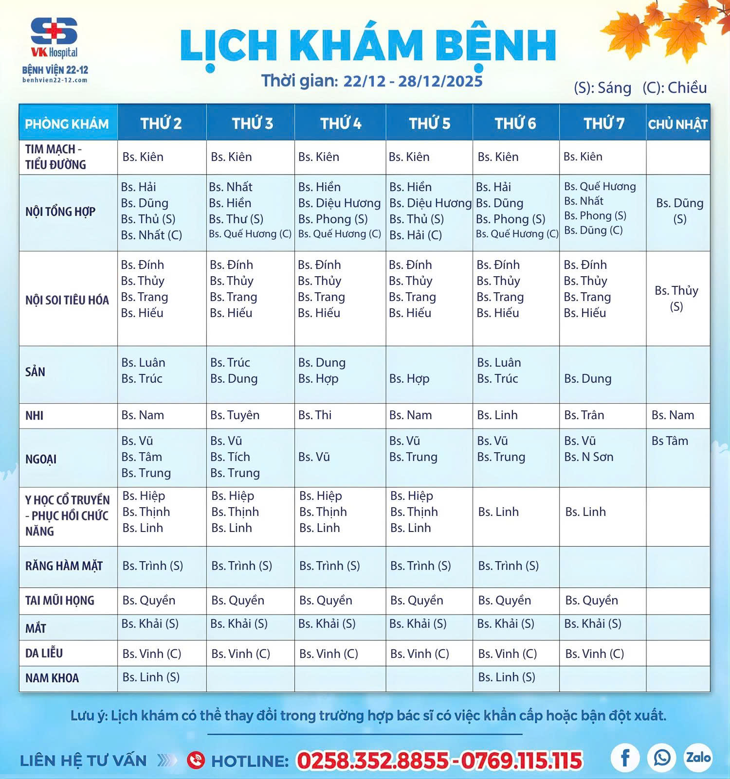 Bệnh viện 22-12 thông báo lịch làm việc từ 22/12-28/12/2025