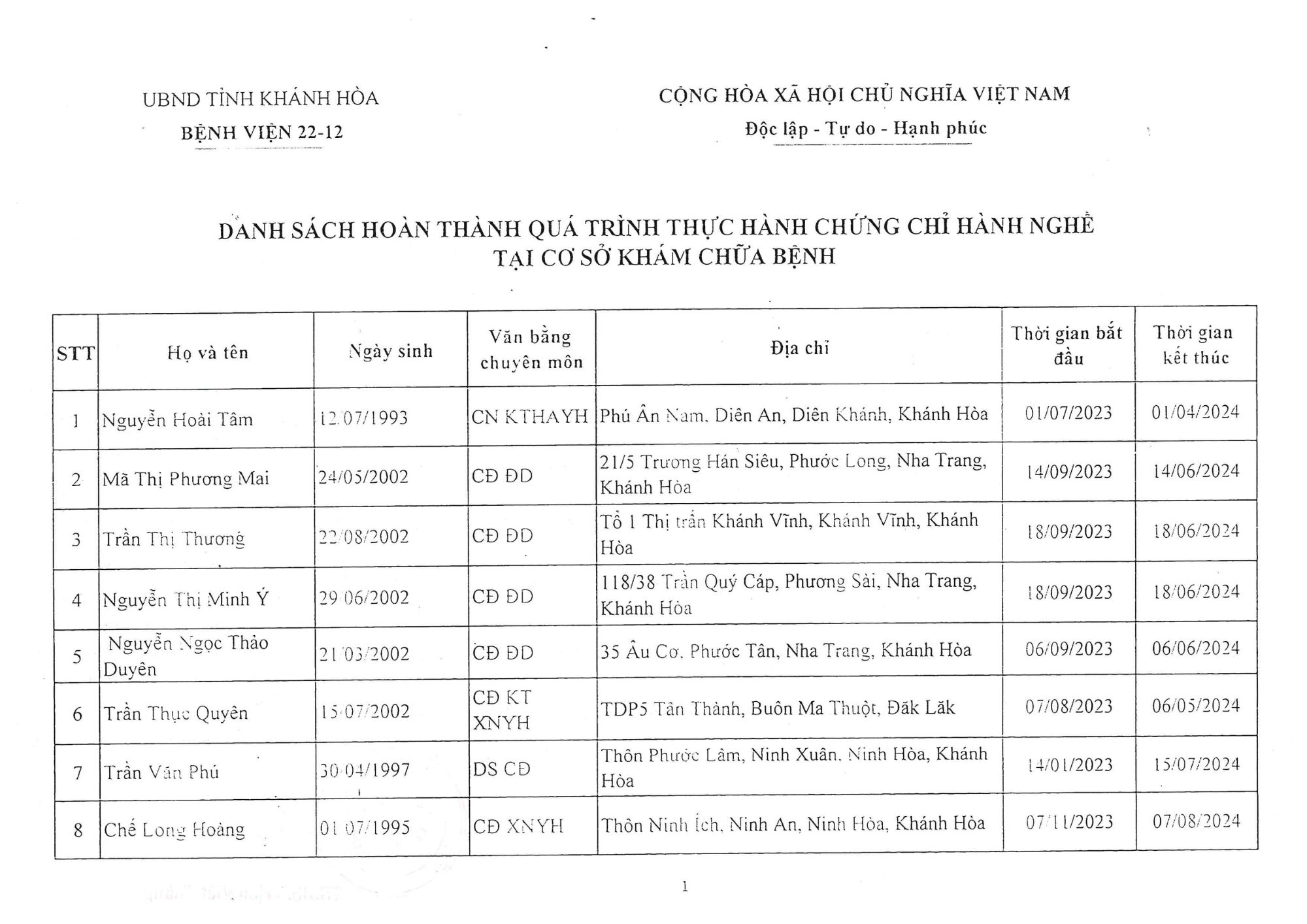 Danh sách người hoàn thành quá trình thực hành CCHN tháng 04/2025