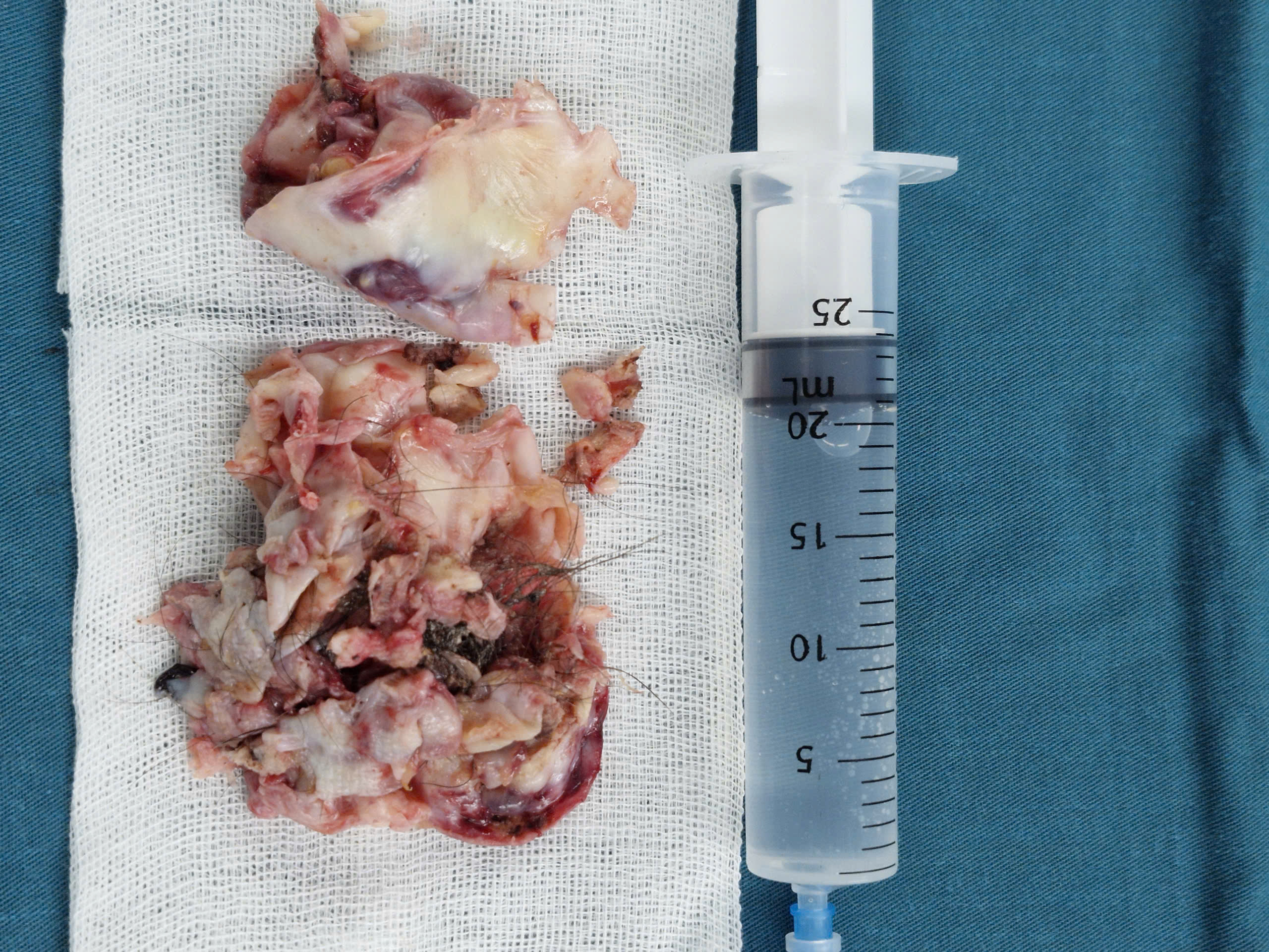 Trong quá trình phẫu thuật, ekip phát hiện khối nang lớn khoảng 10x9cm ở túi cùng trước. Ước tính khối nang khoảng 1kg, chiếm hết ổ bụng. Bác sĩ đã tiến hành bóc tách, gỡ dính vùng mạc nối và nhận thấy đây là nang bì buồng trứng đa thùy. Bên trong khối nang có nhiều tóc và răng, mẫu được gửi giải phẫu bệnh để xác định chính xác tổn thương.