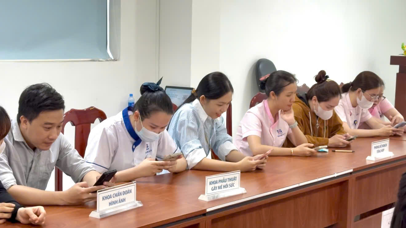 Buổi tập huấn có sự tham gia của điều dưỡng, hộ sinh và kỹ thuật viên các khoa, diễn ra trong không khí nghiêm túc, tập trung và sôi nổi thảo luận.
